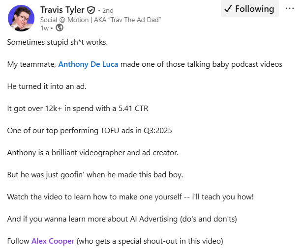 Where it needs balance: Just because something silly works once doesn’t mean randomness should drive your strategy. These ads work best when paired with strong mid-funnel assets that clarify the offer and build trust. And brands with premium positioning need to be careful; pattern-breaking should disrupt, not cheapen the brand.