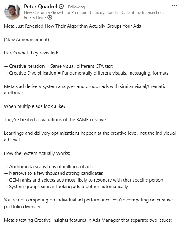 Meta just made something very clear. The algorithm does not evaluate ads one by one the way most teams think it does. If multiple ads look and feel similar, Meta treats them as the same creative, even if the copy or CTA is different.