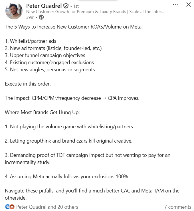 Why it works: Whitelisting builds instant trust, new formats break feed fatigue, and TOF gives Meta room to find fresh pockets of buyers. Cleaning exclusions stops wasted spend, and new angles reach people you’ve never spoken to.