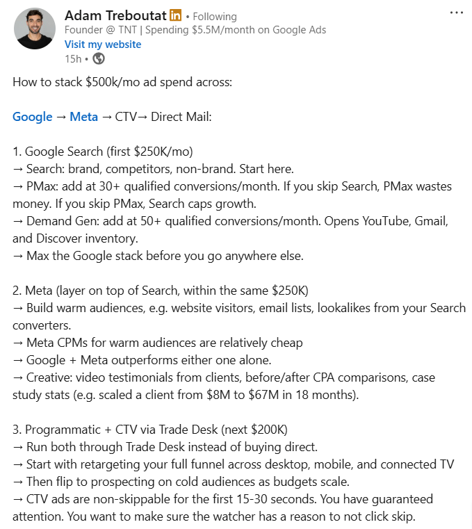 Why it works: High-intent search generates conversion data. That signal powers retargeting and audience expansion across Meta and programmatic. Sequential exposure across channels increases familiarity, reduces acquisition friction, and improves overall conversion probability.