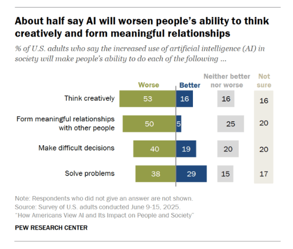 3. Younger Audiences Are More Aware - Awareness of AI is highest among adults under 30, with 62% saying they’ve heard a lot about it, compared to only 32% of those 65 and older. Yet younger adults are also more likely to believe AI will harm creative thinking and meaningful human relationships.