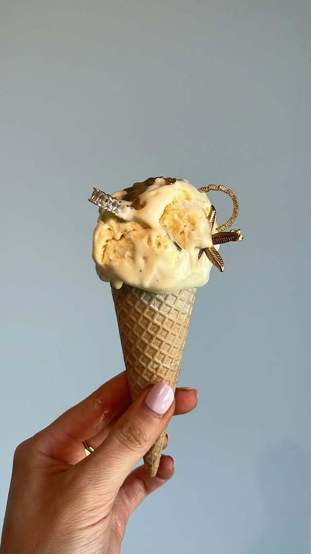 Pale yellow ice cream against polished gold and silver creates a dopamine-heavy palette, soft, creamy, and sparkly. The hand’s pastel nails and minimalist background keep the focus clean while reinforcing femininity and lifestyle aspiration.