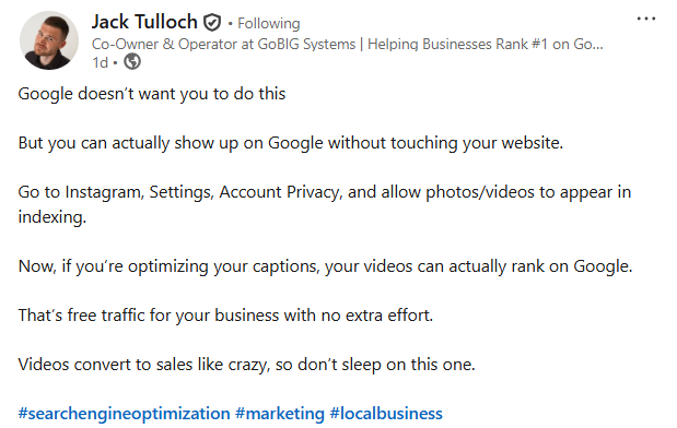 This is one of those small switches almost no one uses. Google can actually show Instagram posts in search results. Turn on indexing, write captions that clearly explain what your video is about, and suddenly, your existing content can show up on Google without building new pages.