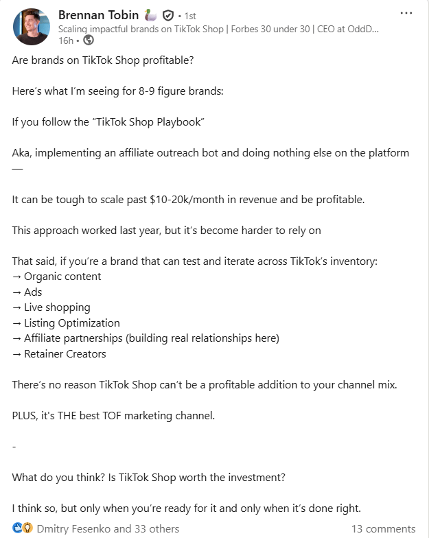TikTok Shop can make money, but not if you treat it like a shortcut. Brands running only affiliate bots often stall at $10–20k a month and struggle with margins. The ones seeing real results treat TikTok Shop like a real channel, not a hack.