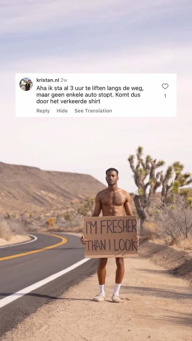 The moment he puts on the shirt and holds a sign that reads “I’m wearing Labfresh by the way,” a car stops instantly. It’s a visual joke, but also the brand’s core value proposition: wear Labfresh, get noticed and respected.