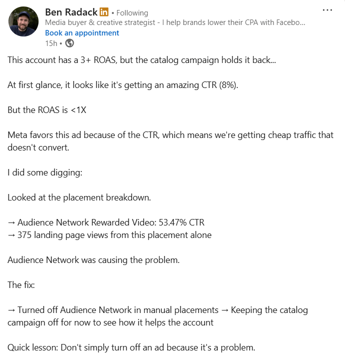 Why it works: Checking placement breakdown reveals where Meta is finding “easy clicks” that do not convert. Audience Network rewarded video often produces accidental or incentive-driven clicks, spiking CTR and landing page views while crushing purchase rate. Removing that placement improves traffic quality and ROAS without changing creative.
