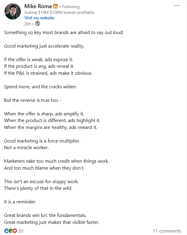 Where it needs balance: Marketing can still create real upside through positioning, creative strategy, funnel design, and retention systems, even when a product is not perfect. It is also possible to misread “fundamentals” when the real issue is targeting, creative fatigue, bad landing pages, or wrong measurement.