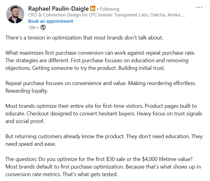 This idea highlights a core trade-off in e-commerce optimization. Tactics that maximize first purchase conversion often prioritize education and persuasion, while repeat purchase growth depends on speed, convenience, and loyalty. Treating all users the same can limit long-term profitability and retention.