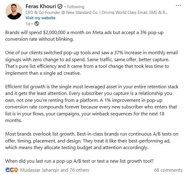 This post highlights how brands overlook email capture efficiency despite spending heavily on acquisition. Improving pop-up conversion rates increases owned audience growth without additional ad spend. Since every new subscriber enters long-term retention flows, even small gains compound into significant revenue over time.