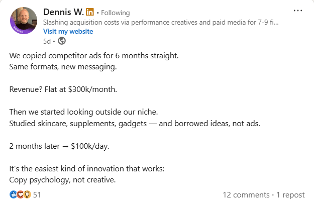 The idea here is that copying formats from direct competitors rarely unlocks new scale. When everyone in a niche uses the same angles, hooks, and structures, the ads start blending together, which explains why revenue can plateau even when messaging changes.