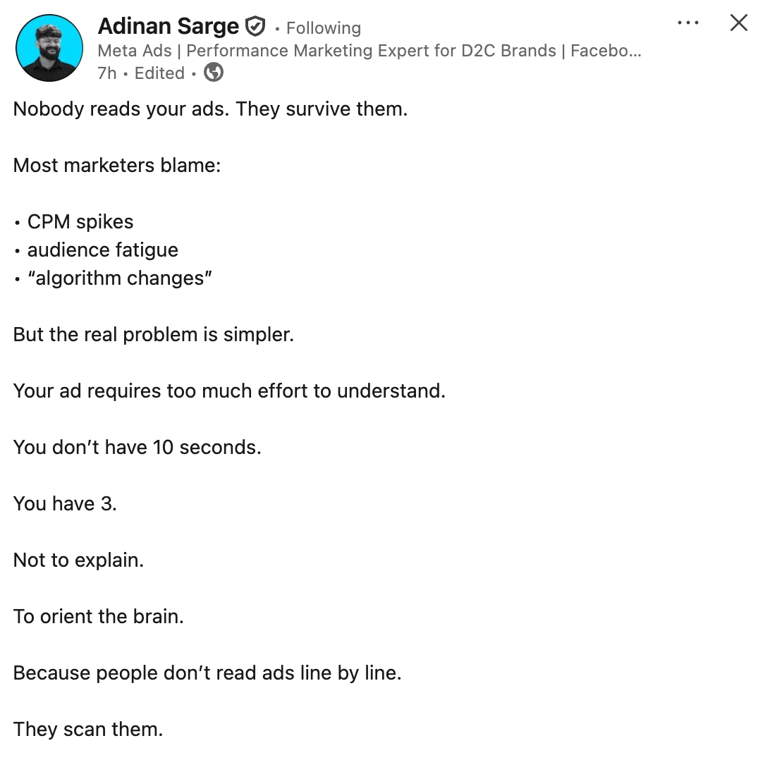 This strategy argues that most ads fail because they require too much cognitive effort to process. Instead of designing creatives like mini landing pages, ads should prioritize visual hierarchy and instant message clarity. The goal is to orient the brain within the first few seconds through scan-friendly design.