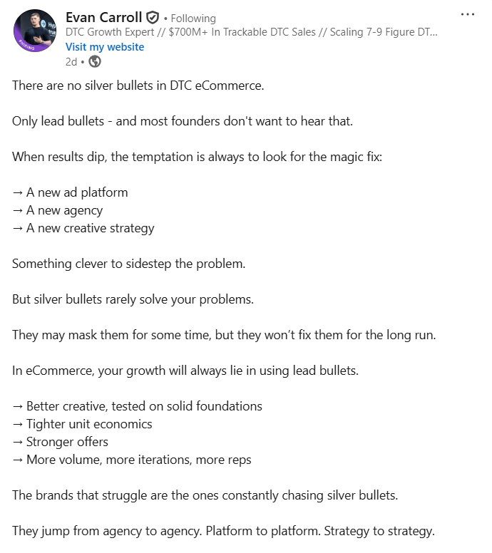 DTC grows through repetition, not magic. Stronger offers, better creative, tighter margins, and more testing reps done consistently. These aren’t exciting fixes, but they compound over time. Each improvement makes the whole system stronger instead of covering up cracks.