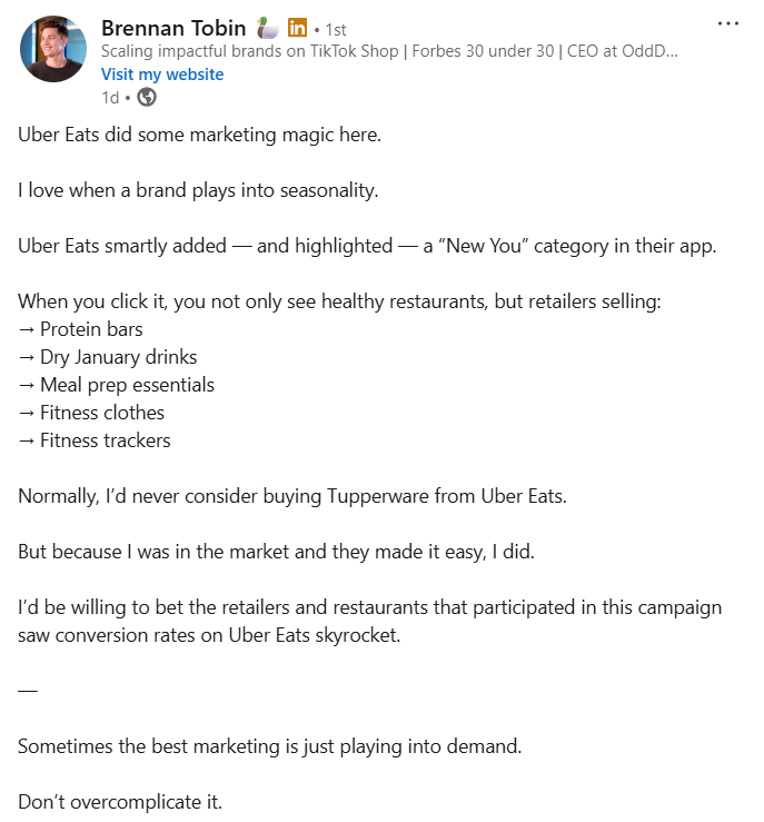 Why this works: Seasonality changes buying behavior fast. When someone is in “New You” mode, healthy food, supplements, fitness gear, and even meal prep suddenly feel relevant. By bundling all of it under one clear category, Uber Eats reduced friction and expanded what felt reasonable to buy in that moment.