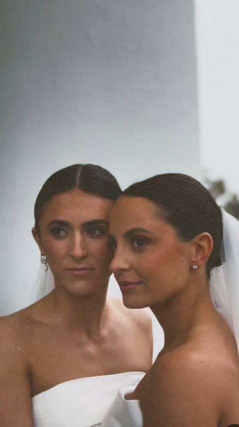 The focus on the dress being beautiful and shared by both brides subtly highlights the product without being overly promotional, which makes the reel feel authentic.