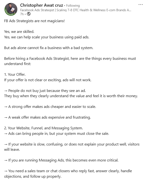 Why it works - When the offer is clear, the website converts, messages are handled well, and creative volume exists, ads become a multiplier. Strong assets make testing easier, budgets work harder, and optimization actually compounds. In those conditions, a strategist can unlock real scale.