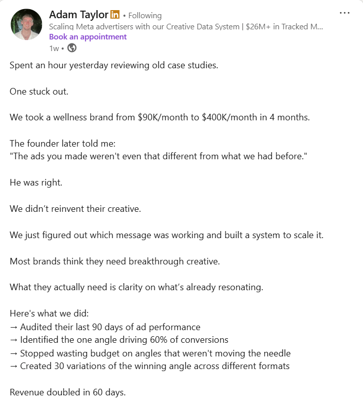 This story shows how big growth often comes from clarity, not reinvention. The wellness brand went from $90K to $400K a month, not because of fresh creative magic, but because someone finally identified the message that was already converting and built a system around it.