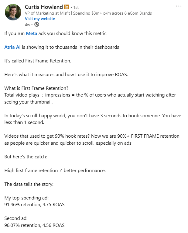 Where it needs balance: Chasing the highest possible retention number can mislead you into optimizing for broad curiosity rather than buyer alignment. Not every ad benefits from a super-general hook that keeps everyone watching. If retention drops below 90 percent without clear qualification, that’s a sign the opening frame is confusing, boring, or irrelevant, and it’s time to test new angles.