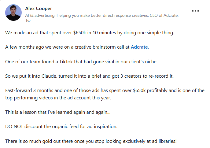 This example shows how a single organic TikTok idea, not a polished ad, not a complex concept, became a $650K+ profitable ad after being re-recorded by creators. The team didn’t reinvent anything. They simply spotted a viral pattern, turned it into a structured brief, and recreated it with relevance and clarity for their client.