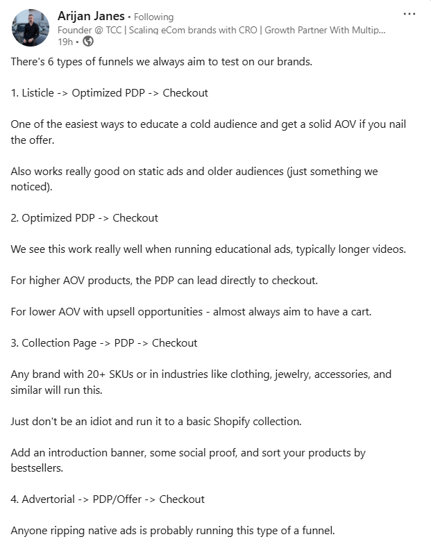 Arijan James outlines core funnel types, from listicles and advertorials to quizzes and direct sales pages, and they’re all valid, but each serves a very different purpose depending on your AOV, product complexity, and audience awareness.